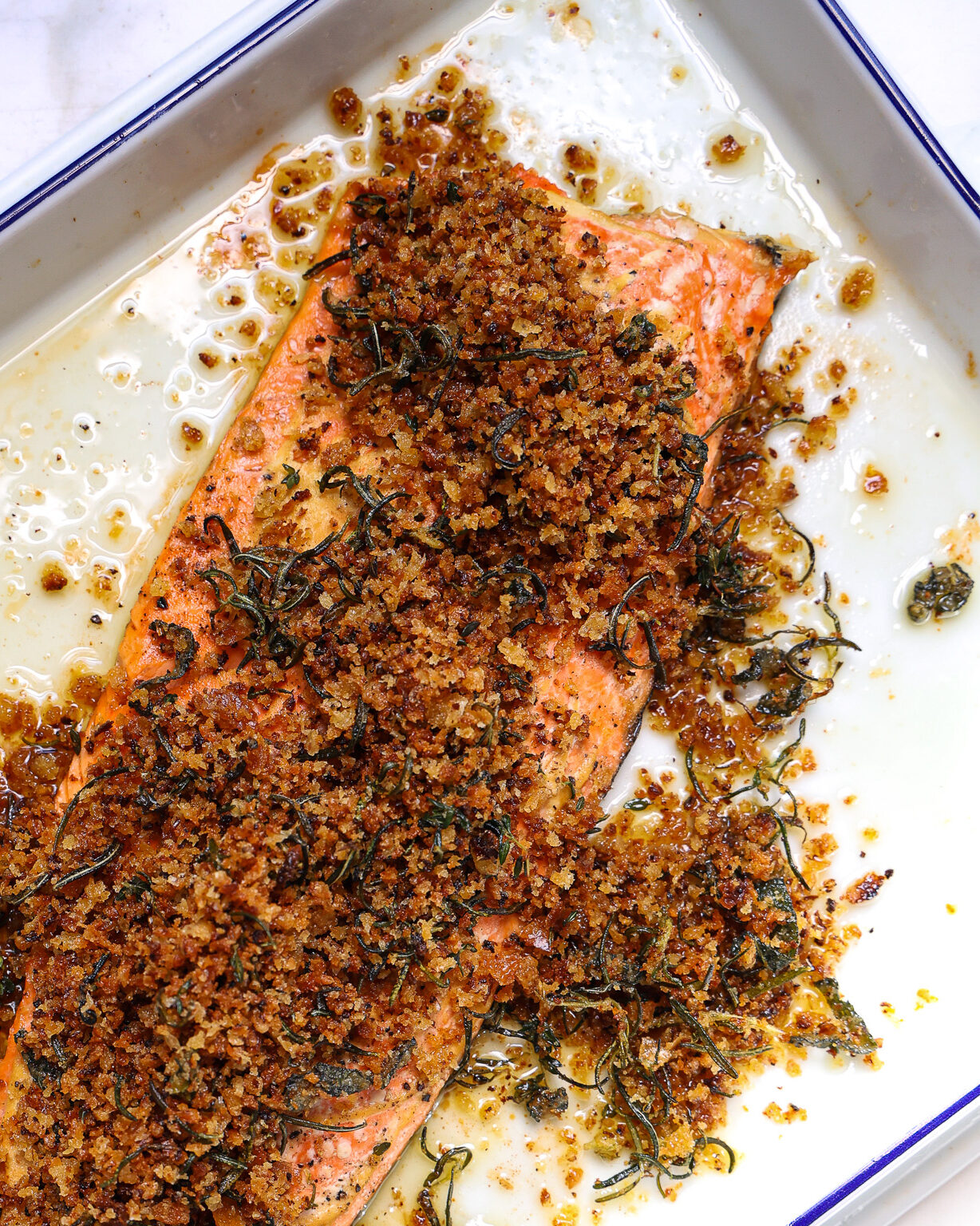 - The bread crumb topping is crisp and filled with Thanksgiving-style herbs – rosemary, thyme and sage all join the party here, along with a hint of nutmeg. Fry all these up in butter and they’ll make the salmon feel festive, even though we usually doubt salmon as a festive-style food.