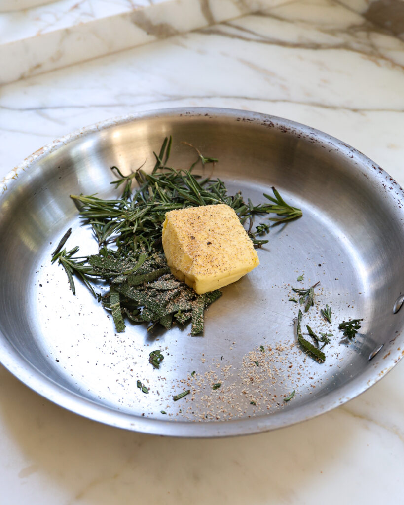 - While the salmon is roasting, add the 6 tablespoons of butter, 1/2 cup rosemary leaves, 2 tablespoons thyme, and 2 tablespoons sage to a medium pan.