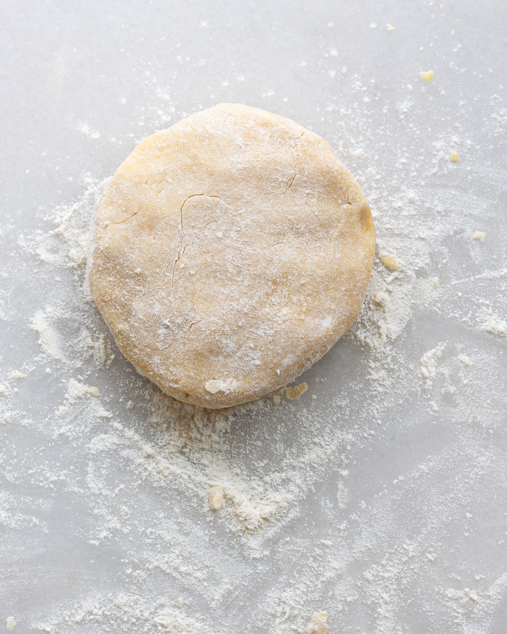 - Move the dough to a work surface and press the dough down until is is about 2" high. Use a bench scraper to cut the dough into 3 pieces, pile the pieces on top of each other, and press them down. This is creating more lamination in the crust! Press the dough down into another 2" high mound, rotate 90 degrees, and repeat the same process.