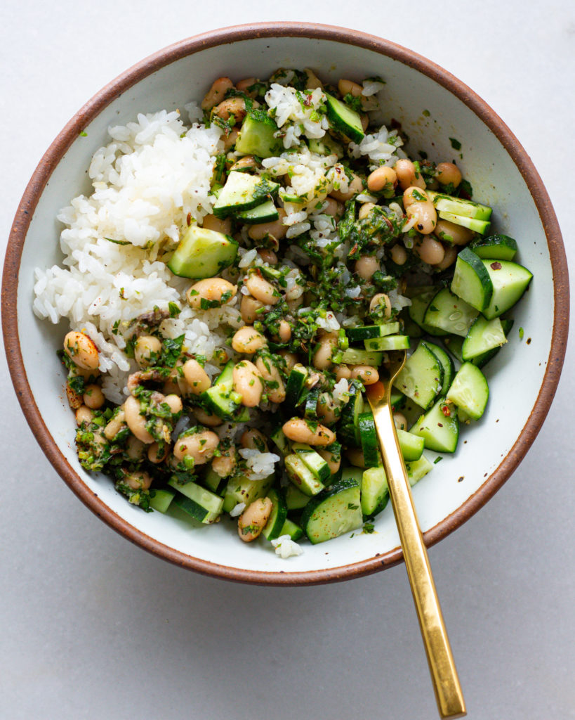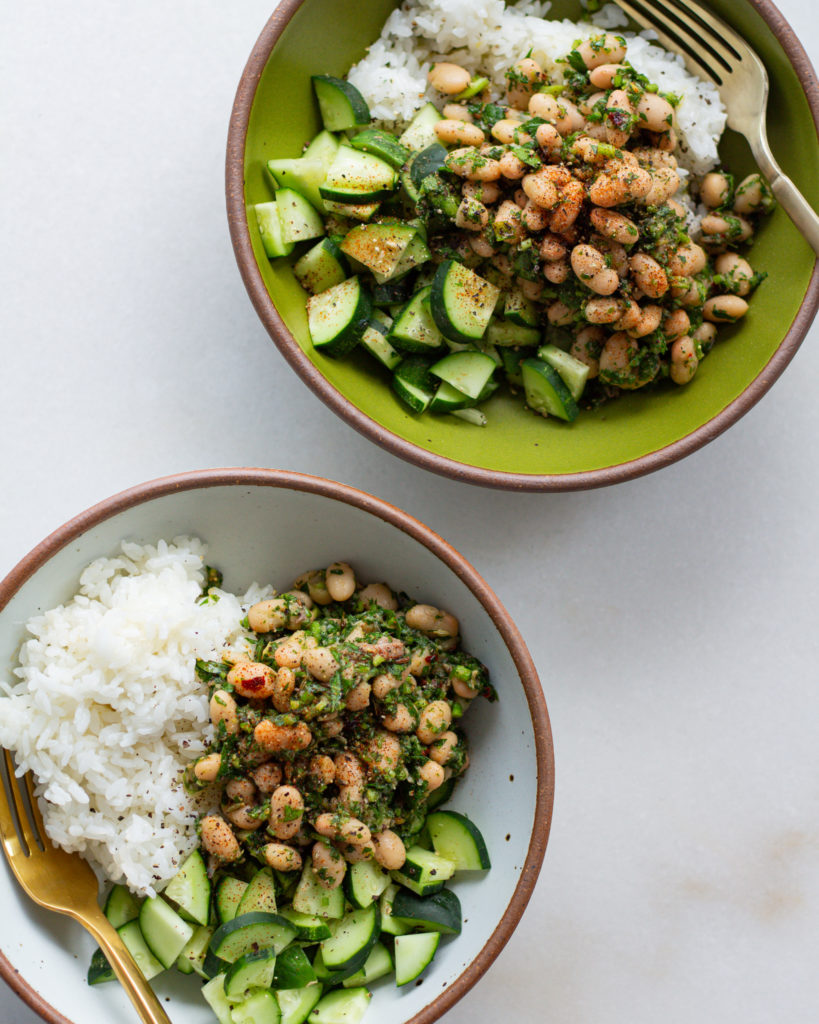 - To serve, add a portion of rice to each bowl, then add the chopped cucumbers, and top with the beans. Drizzle any remaining anchovy oil on top. Garnish black pepper, paprika and any leftover parsley!
