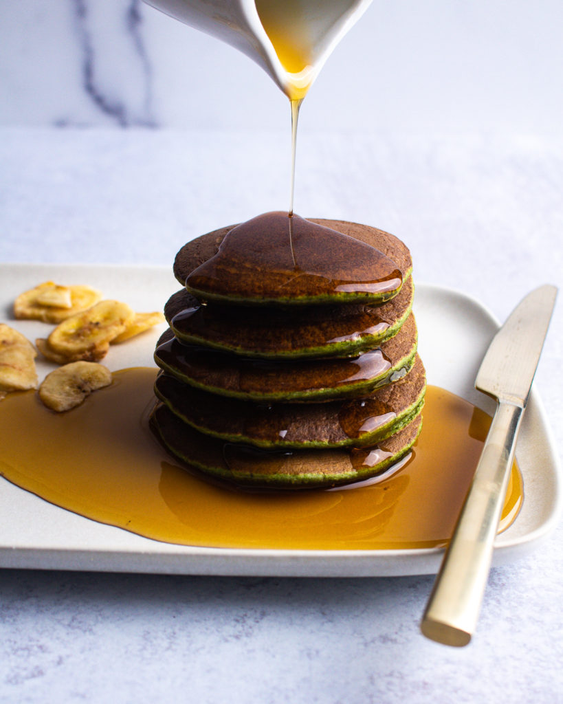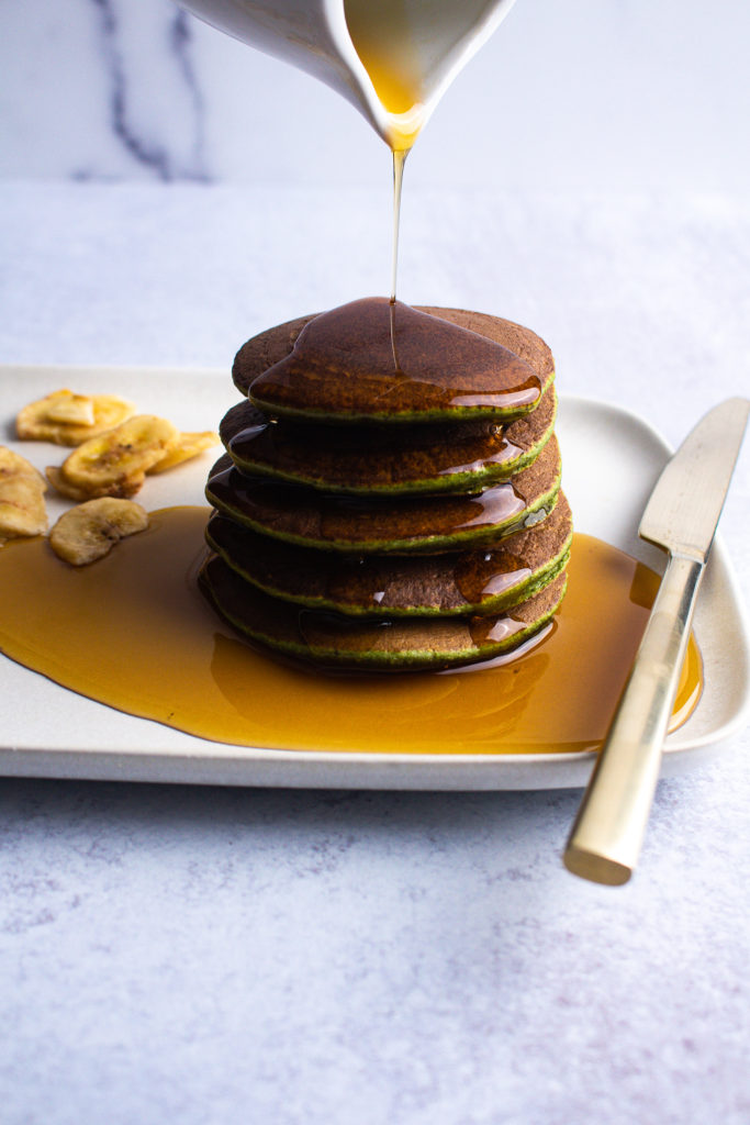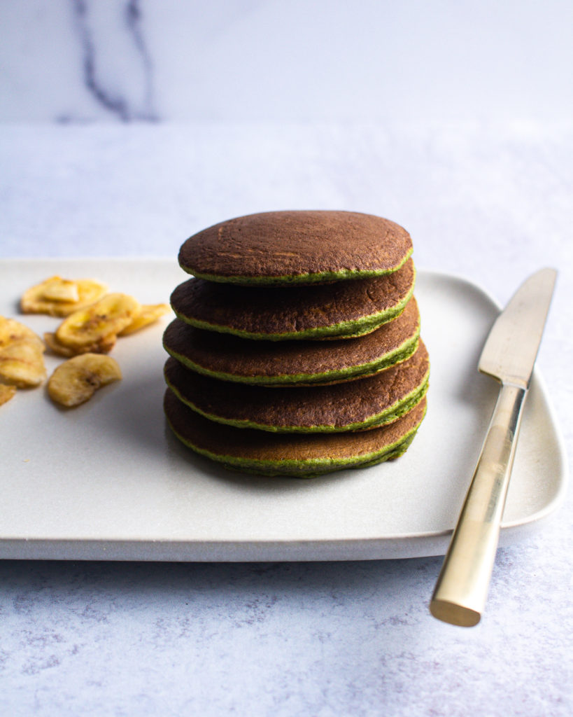 Just like with most of my other pancake recipes, it is crucially important to cook this one at a lower temperature than normal pancakes, and for just a bit longer. Since these include the egg and the banana, they need a little more TLC to become perfectly cooked through, but it’s worth it in the end! When you bite in you’ll be shocked at how similar to a classic banana pancake these taste (green color included!)
