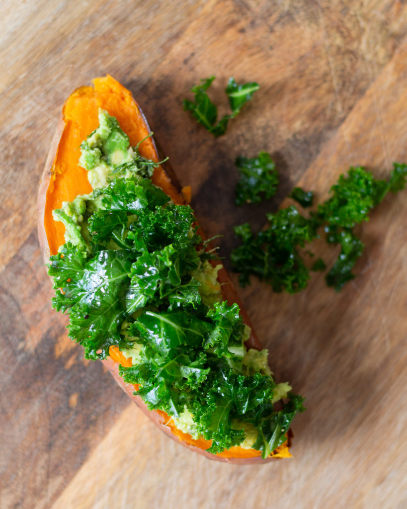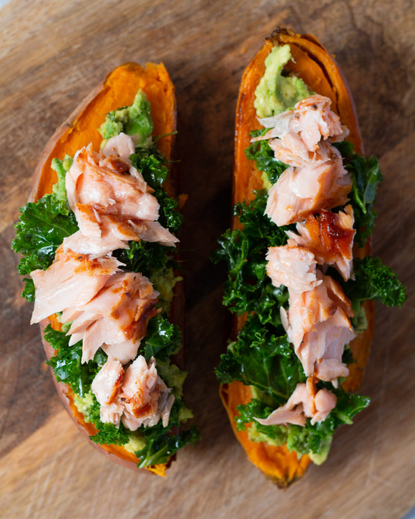 - To assemble, cut each sweet potato in half, top with the avocado mash, then the kale, and then chunks of the salmon fillet.