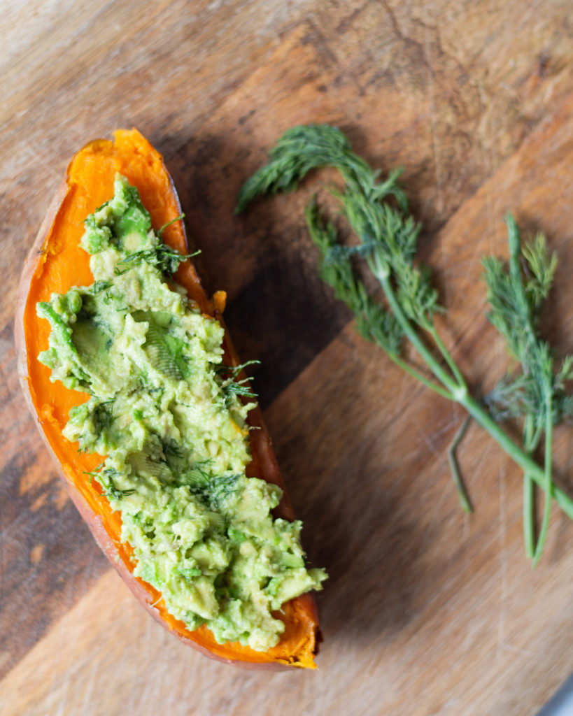 I’m just here to provide the inspiration, and you can take it and make it what you want! For this recipe, we’re using a fluffy sweet potato, barbecue salmon, lemon dill avocado and evoo kale and mashing it together into the best, most nutritious, meal prep lunch. All you have to do is roast everything, then assemble and eat!