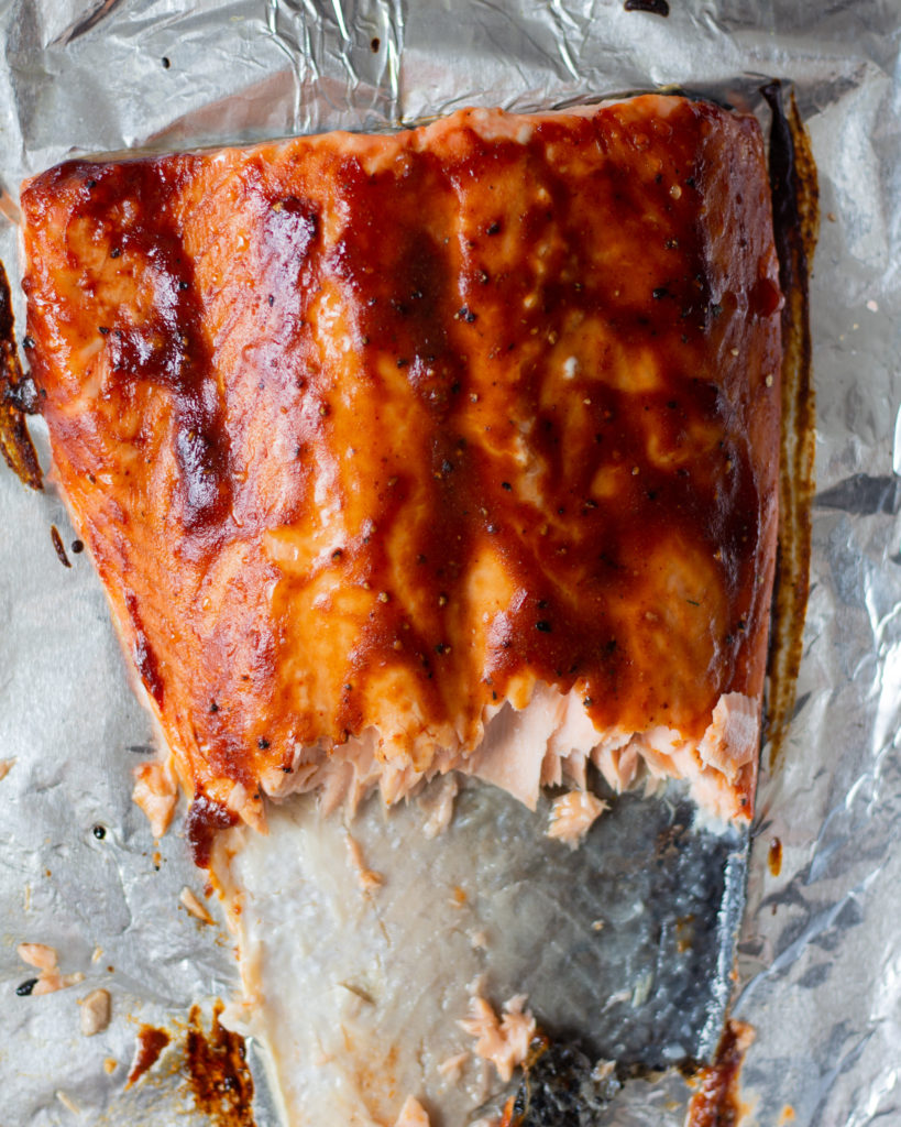 Place the entire salmon on a foil lined baking sheet. Slather it in the barbecue sauce of your choice (I like a really spicy, vinegary one!). Put the salmon in an oven at 425F and cook for 13-15 minutes, or until the internal temperature at the thickest part is 135F or higher.