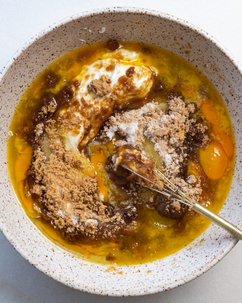 - In a large bowl, whisk together the 2 eggs, 113 grams of butter, 110 grams of granulated sugar, 110 grams of dark brown sugar, 85 grams of greek yogurt, and 1 teaspoon of vanilla extract until smooth.
