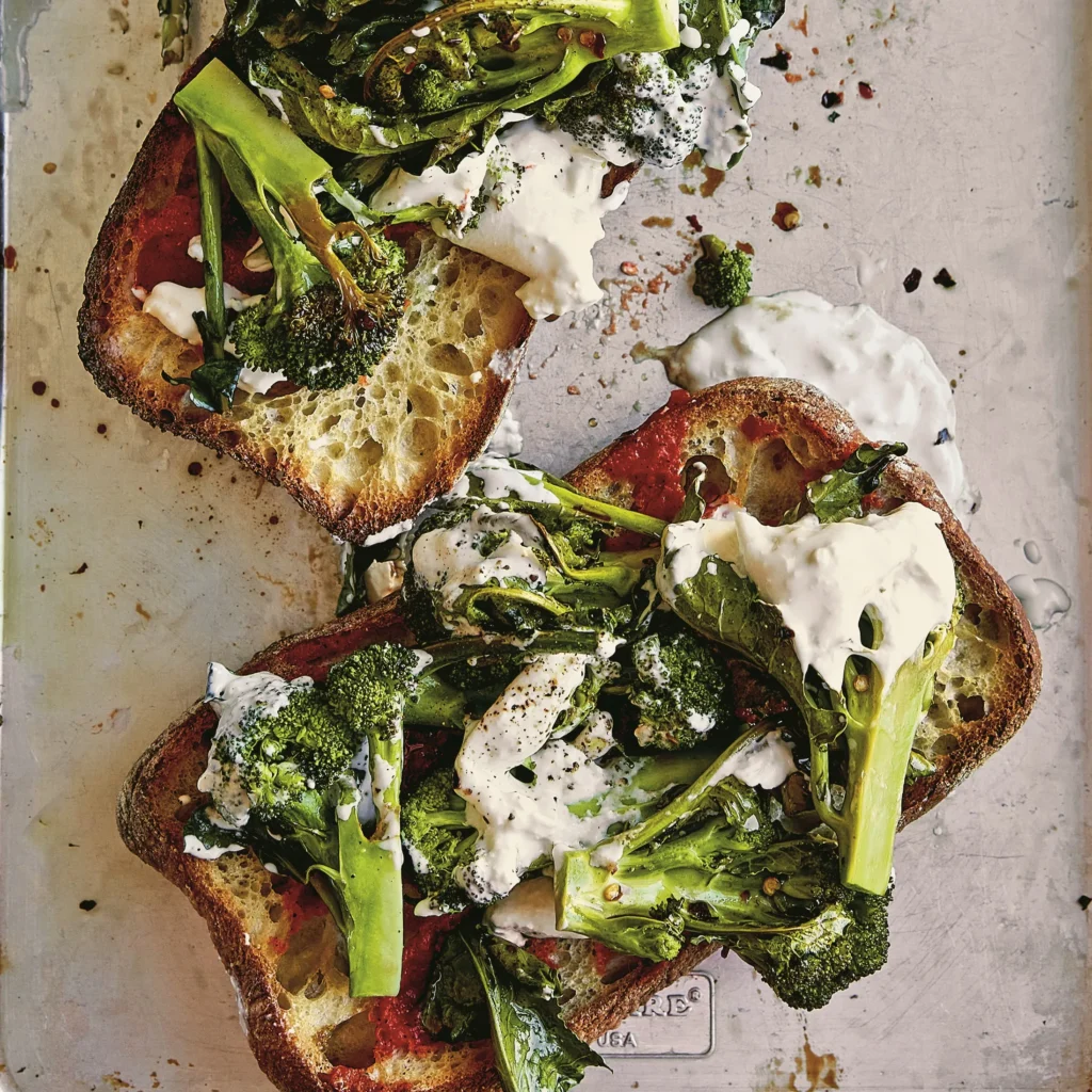 - Add a swipe of the roasted pepper sauce to each slice of bread and pile the broccolini mix on top. Drizzle with more sauce if you'd like, season with a few cracks of black pepper, and enjoy immediately.