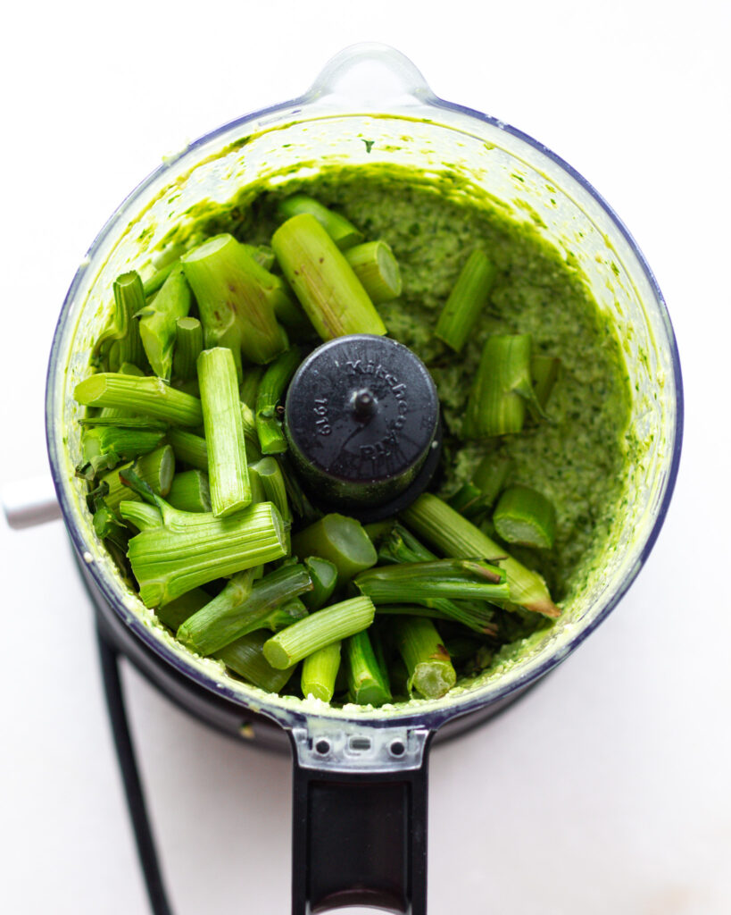 - When the broccolini stems are out of the oven, let them cool to room temperature. Add them into the food processor and process until you form a thick spread. It won’t be completely smooth, but the texture is still delicious. Taste and season with salt and lemon juice as needed.