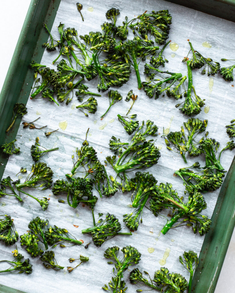 The best way to roast broccolini is two-fold. First, you want the broccolini tops to get nice and crispy and a little bit charred. But for the bottoms, you want them to stay a verdant green and get almost no char in the oven.