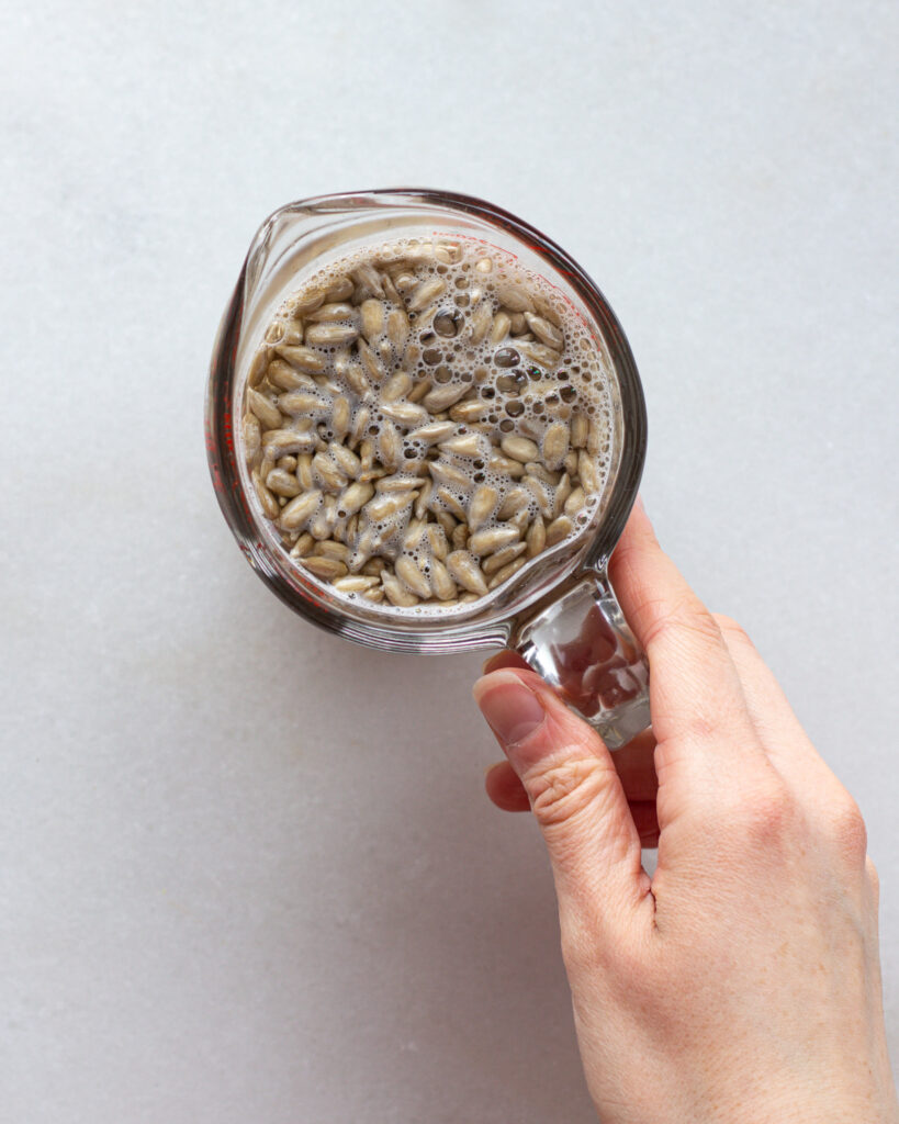 So either before or while the broccolini is roasting, add the sunflower seeds to a heat-proof bowl or cup. Pour boiling water over them and let them sit for 5 minutes. The longer they sit, the easier your job is!