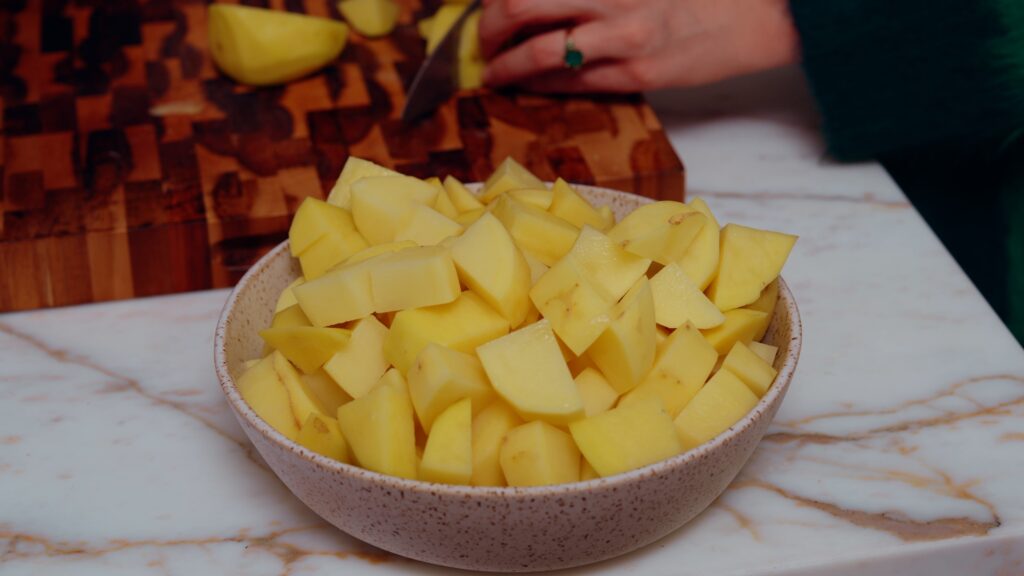 I do think the Yukon Gold is one of the best potatoes out there. I think for maximum crispiness, it’s best to peel them and dice them. The boiling doesn’t matter so much, as what you do afterwards…