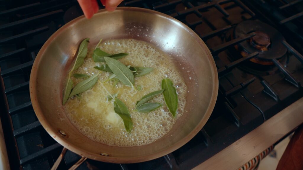 - When the butter has melted, add one sage leaf. If it lightly sizzles, feel free to add the rest. If it doesn’t sizzle or if it fizzes too much, adjust the heat accordingly until it hits a light sizzle.