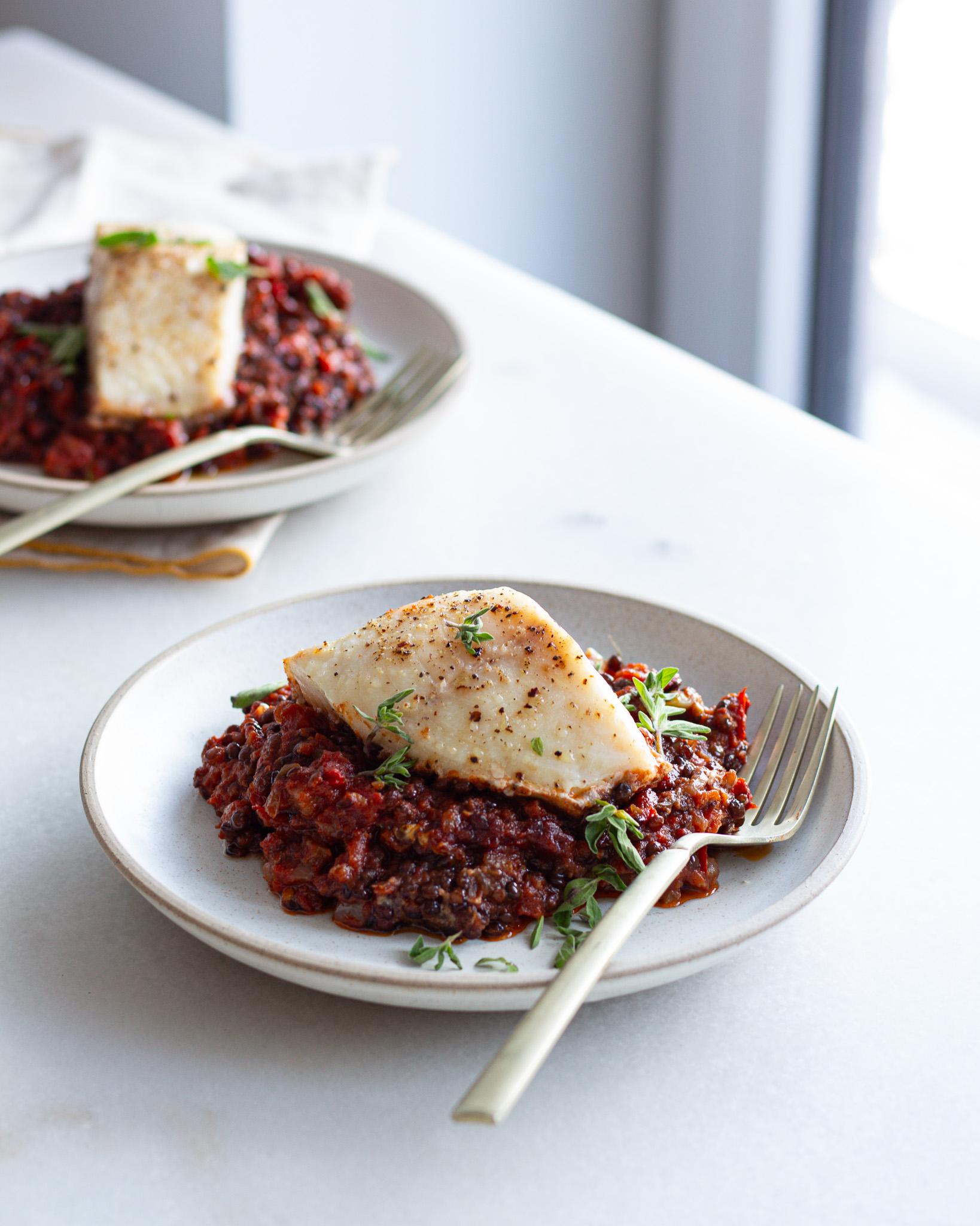 This surprised me so much! It is so rich and full of umami from the jammy tomatoes. For me, the cod was unnecessary- I prefer plants anyway. I will definitely make the tomatoes/lentils again but maybe top it with a grilled mushroom or tofu.
