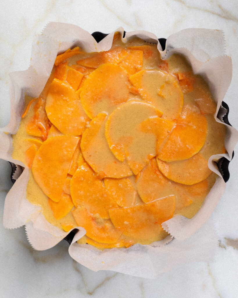 To make the butternut squash supremely soft, you have to thinly slice it with a mandolin. This is the only pain point of the recipe, and it’s worth it to get a perfectly soft butternut consistency in your cake.