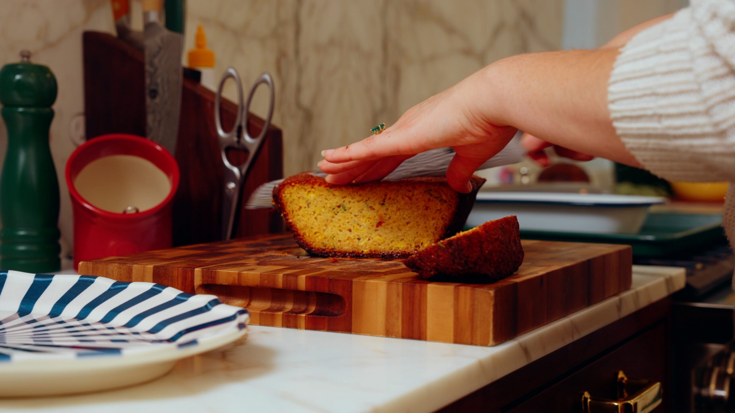 - Let the cornbread cool for about 45 minutes, or until the pan can be safely handled with bare hands (it can still be warm, but just not hot). Remove the cornbread and slice it with a serrated knife, then serve warm with the honey butter.