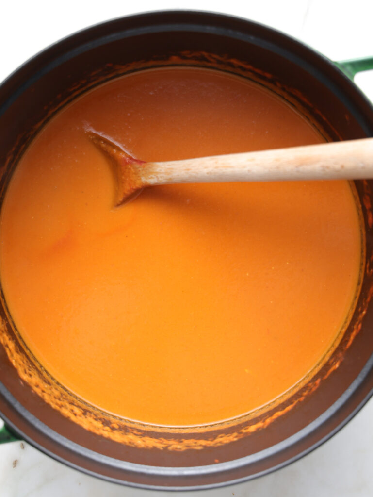 The key to this tomato soup is to caramelize the gochujang, which deeply changes how the red pepper paste eats. Caramelizing it mellows out its spiciness, but also brings out the sweetness and depth of flavor that you usually associate with gochujang. With enough fat in your pan, caramelized gochujang turns into something pretty magical.
