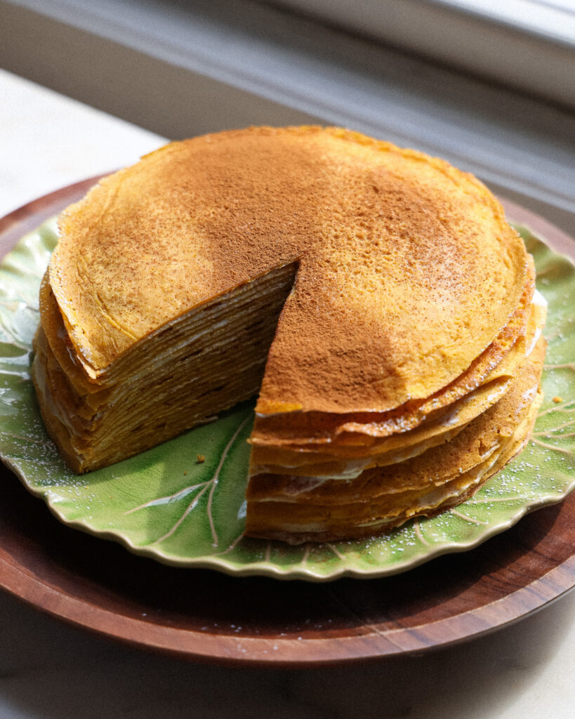 - Use a sieve to sift a tablespoon of powdered sugar on top of the crepe cake, dust with any excess cinnamon. Cut into 16 slices and serve!
