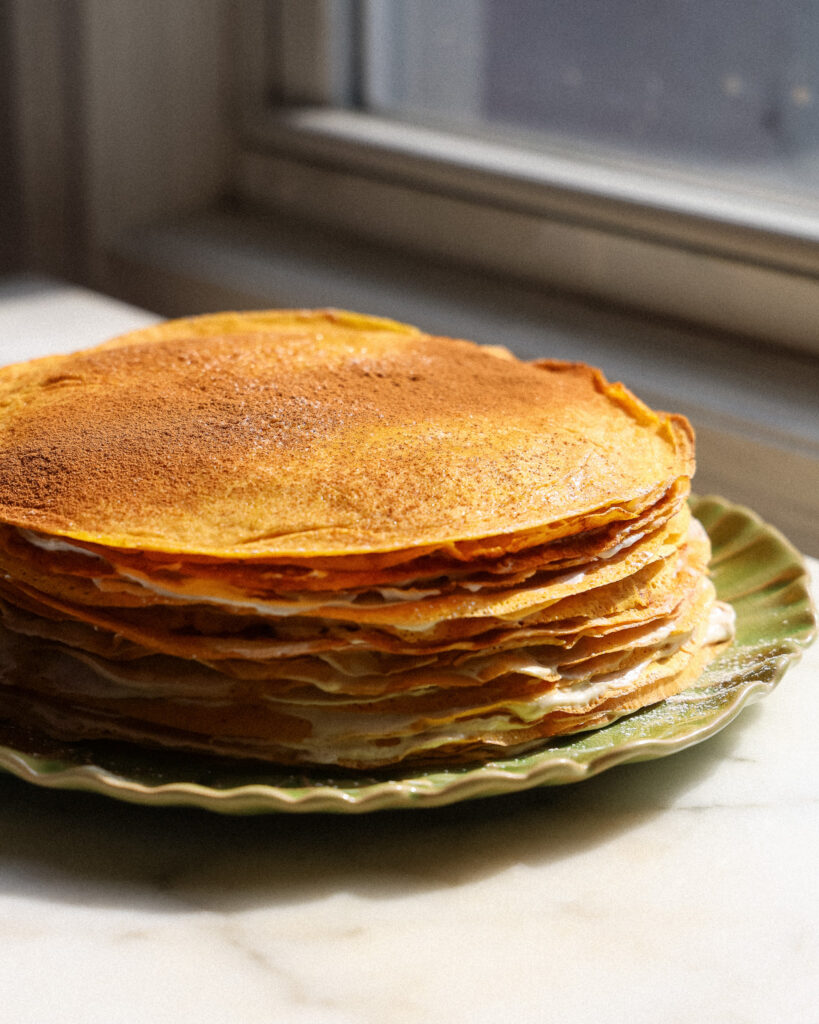 To keep this crepe cake manageable and not-too-sweet, I like to use vanilla yogurt or skyr and the layer in between the crepes. Unlike whipped cream, this is something that lends a little protein while still giving a hint of sweetness. It makes this recipe a fun, filling breakfast recipe, and I’d be thrilled to have it at any brunch.