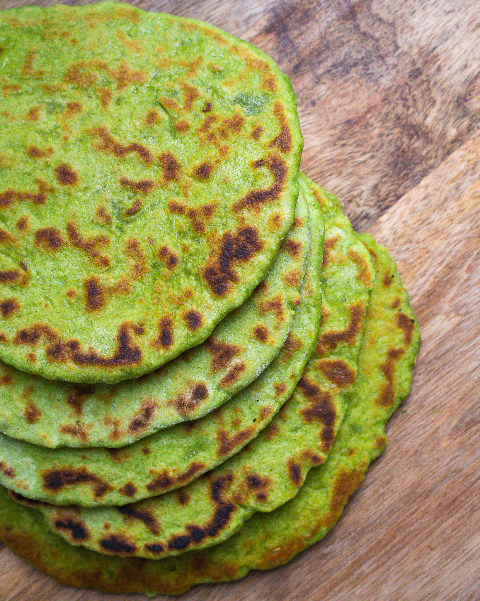 Bright green and insanely delicious, these flatbreads are my go-to for any quick lunch or dinner. I make a batch at the beginning of the week and eat about one a day, usually doused in a heaping serving of hummus or olive oil.