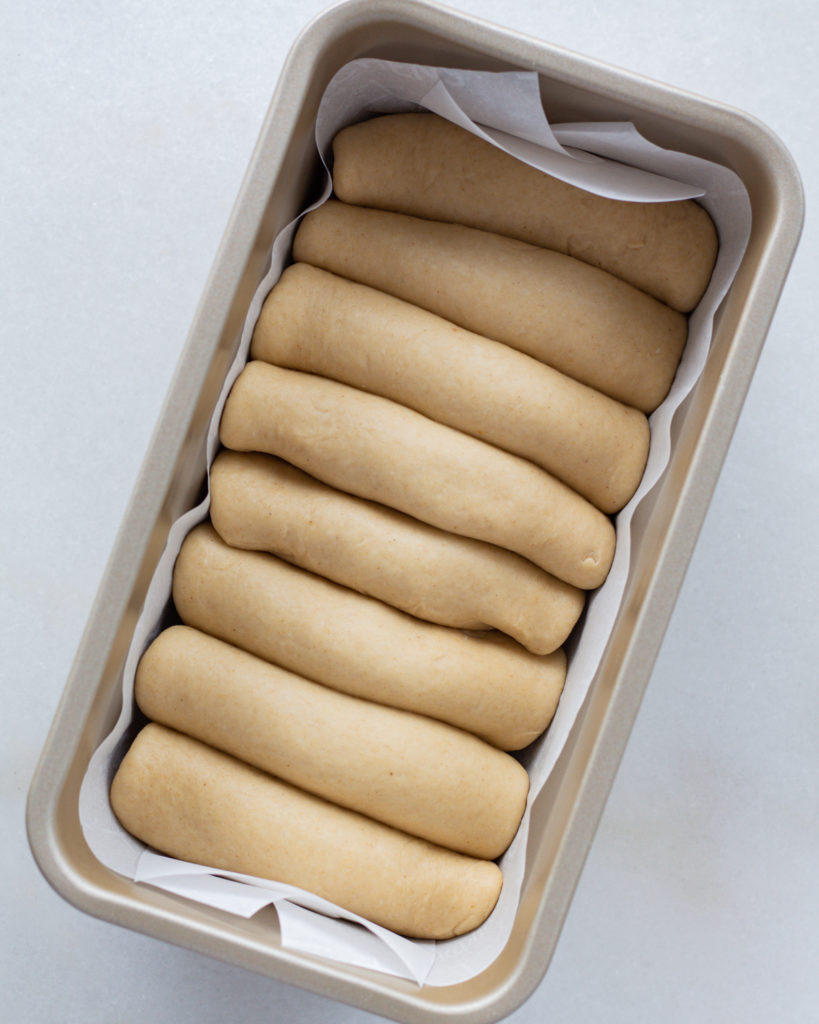 • Place the “cigars” seam-side down in the parchment lined baking sheet. All 8 pieces should fit, but it will be snug!
