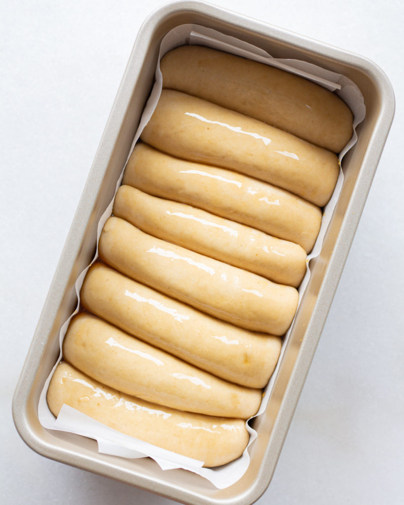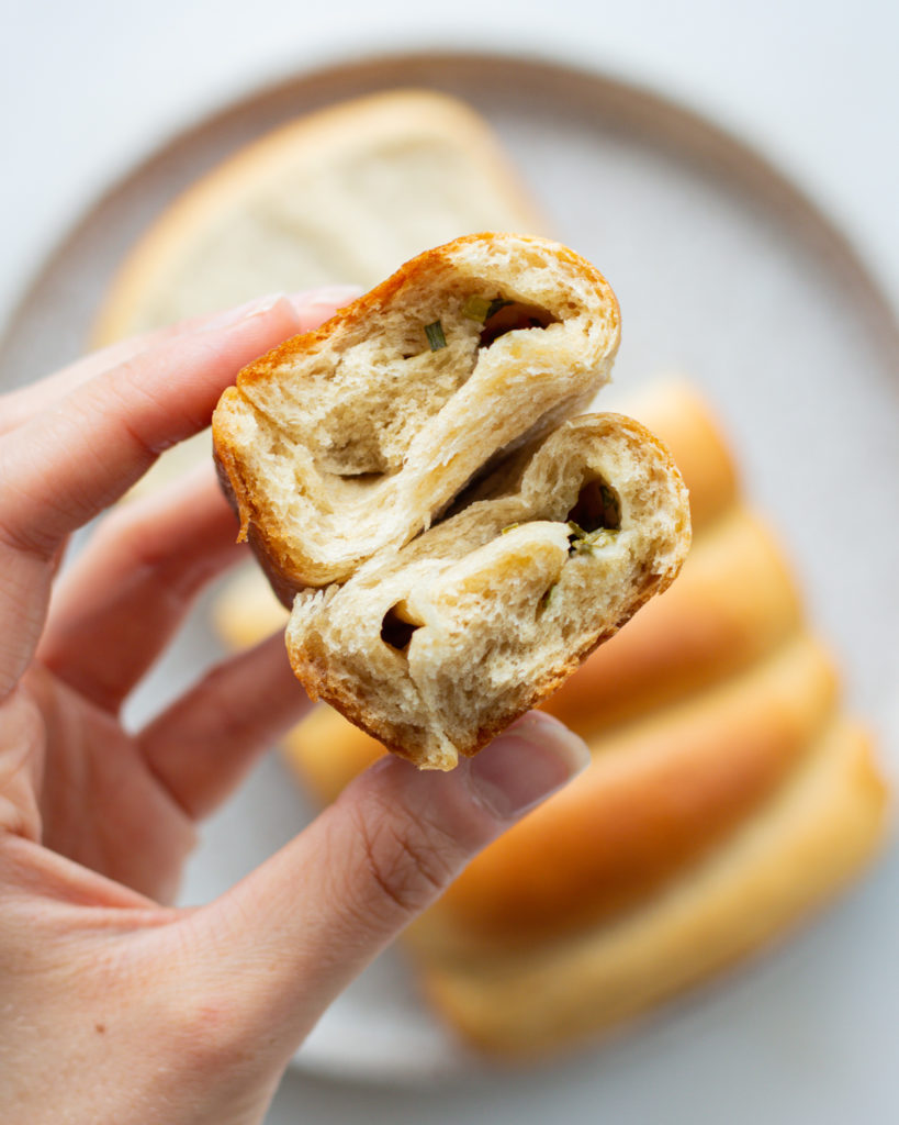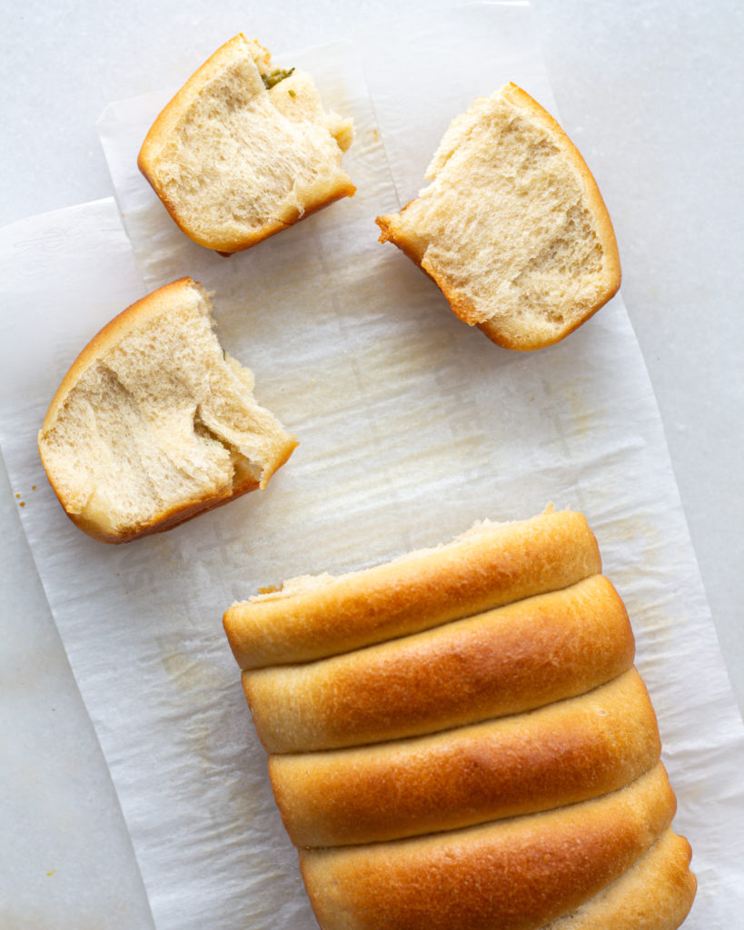 After the dough is prepped, it’s all about shaping, stuffing and baking the chive butter bread. It’s super simple, but here are the deets: