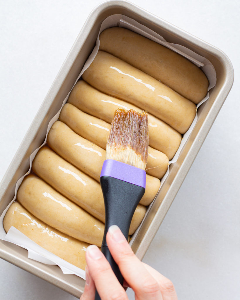 Simply put, we are removing the egg (you don’t need it when the yeast provides most of the lift and flour provides all the structure) and replacing the classic brioche enriching ingredients with plant-based versions.