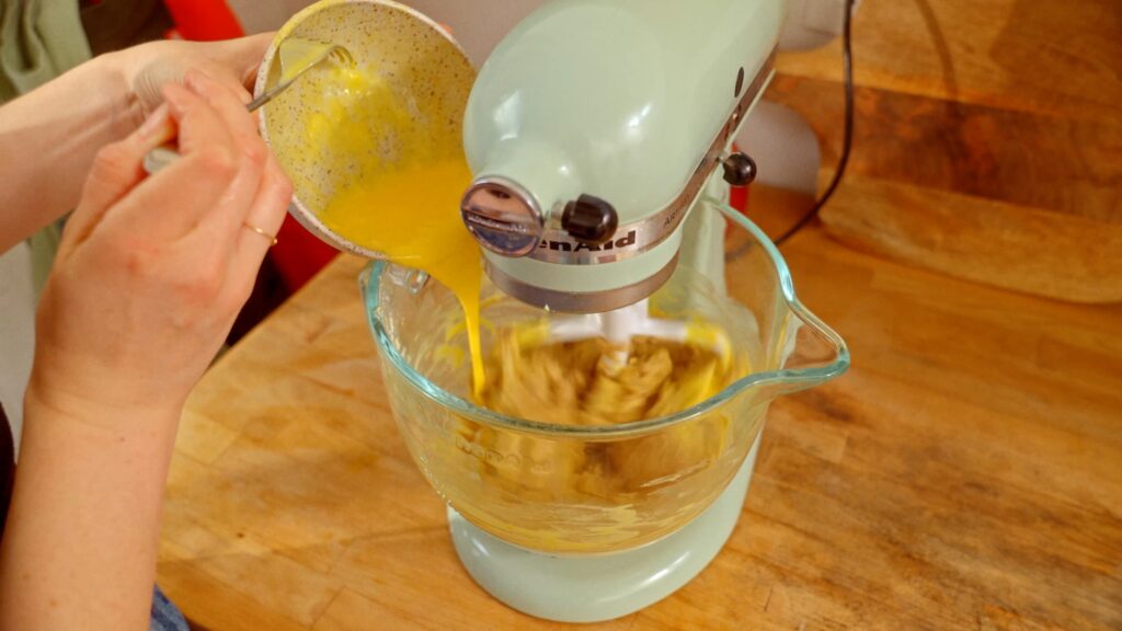 - In another bowl whisk together the 2 eggs, 2 egg yolks and 60 grams crème fraîche until smooth. Put the mixer back on low and gradually pour that in to combine.