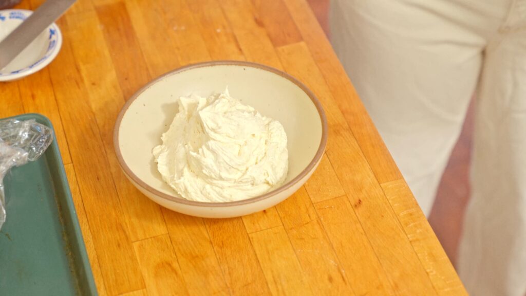 - Add a layer of brown butter bourbon buttercream. The only time we are using this buttercream is for in between the layers, So add a liberal amount, don’t be shy!