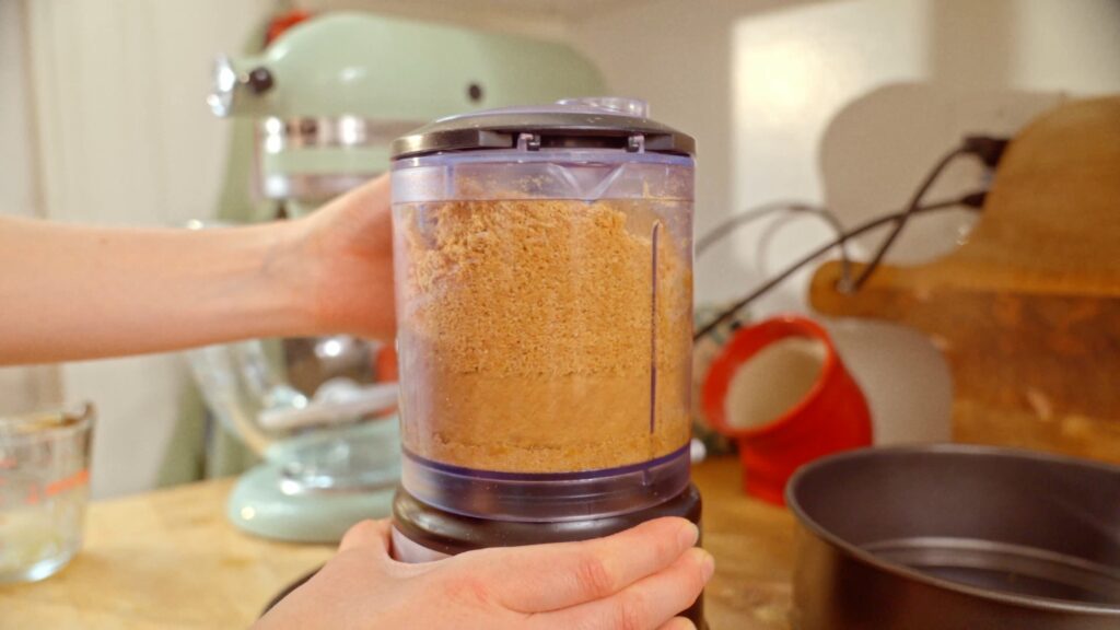 You’ll pulse two whole packs of graham crackers (yes, 36 rectangles!) in a food processor until they’re finely ground, like sand. Then mix in melted salted butter until the crumbs hold together just slightly. Divide this mixture between two 8-inch springform pans and press it into a flat, even layer using the bottom of a cup or measuring cup.