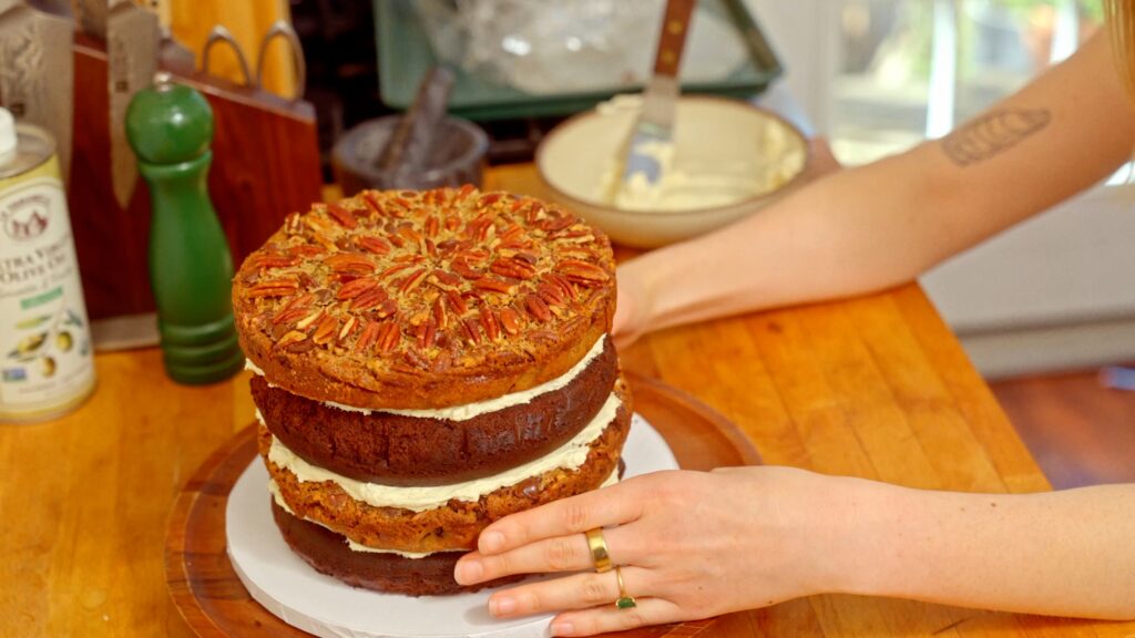 For my other cakes, you see I like to layer them in the pans I baked them in, then flip them onto the surface I plan to decorate on. While this works well for most cakes, it won’t really cut it with this Chocolate Bourbon Pecan Pie one, since the pecan topping is meant to be on top from the start.