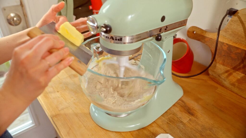 - With the mixer on low, add 227 grams of softened salted butter one piece at a time until the mixture starts to resemble a cookie dough. Then turn off the mixer.