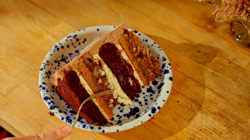 This recipe uses two buttercreams: a brown butter bourbon version and a classic chocolate one, both built on the American buttercream technique (no meringues or sugar syrups here). This makes the icings a bit less stable than other buttercreams, but they are the easiest frosting to make, and so so delicious. I think it captures the nostalgia of this cake perfectly, since this is the icing that will most closely reflect the icings you’re used to having on birthday cakes.