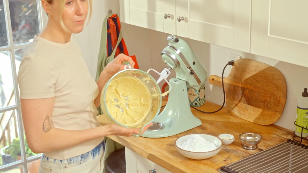 - Beat for 2 minutes on medium-high or until the batter is fluffy and light. Scrape down the sides as needed.