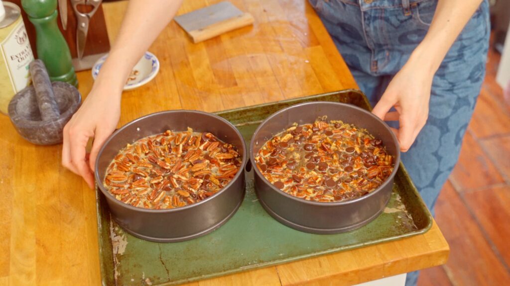 - Evenly distribute the batter between the two prepared cake pans. Decorate the top of one pie with the pecan halves you set aside by lining them in concentric circles. Put the cake tins on a sheet pan and bake for 40-45 minutes, or until firm.
