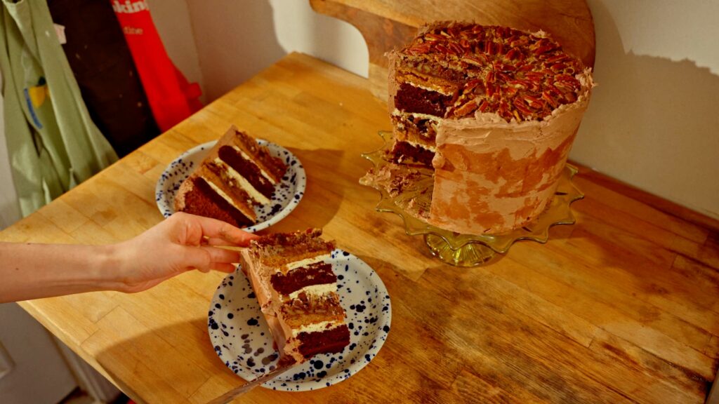 How to make the Chocolate Bourbon Pecan Pie Cake layers
