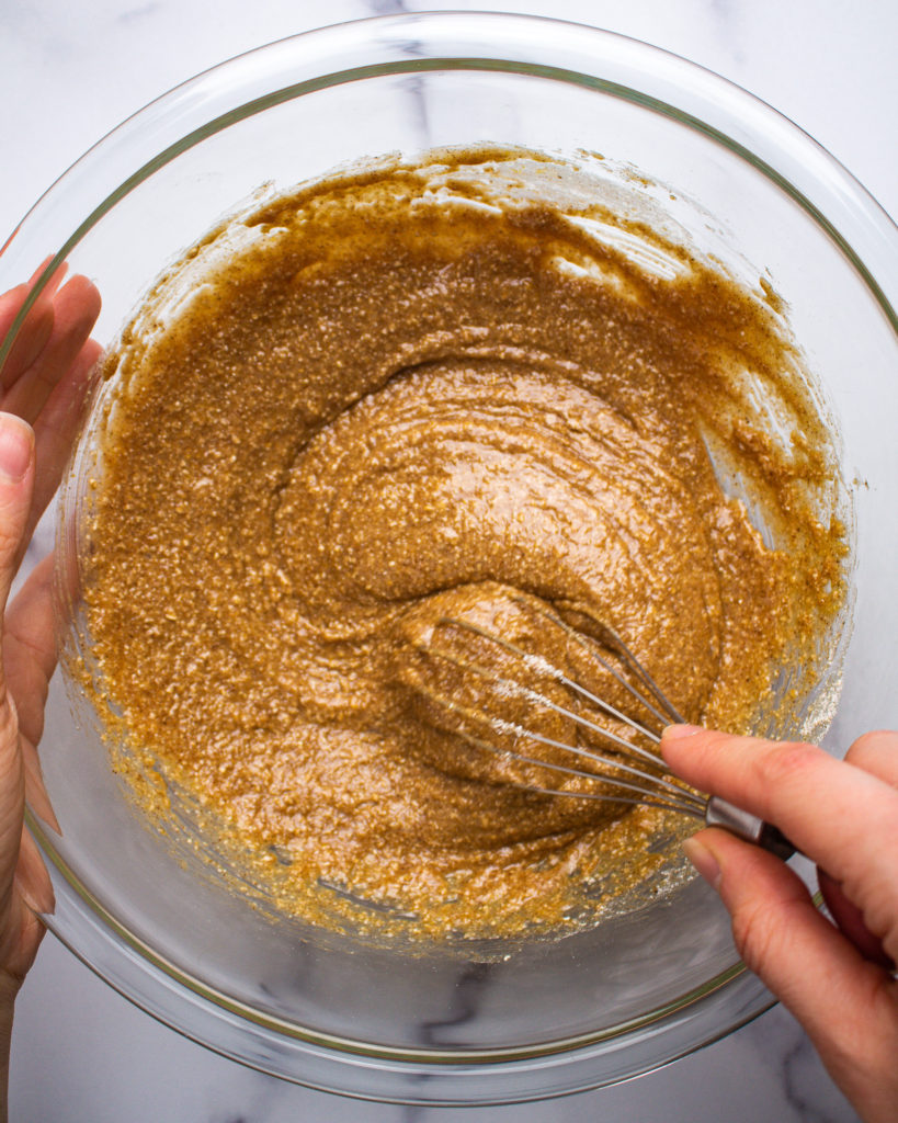 - In large mixing bowl, whisk together 130 grams of almond butter, 1 egg, 140 grams of maple syrup, and 1 teaspoon of vanilla.
