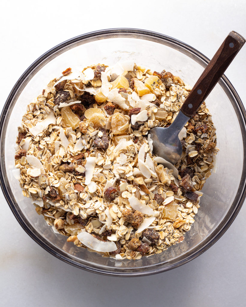 - To a large bowl, add 4 cups rolled oats, 1/3 cup flax meal, 1/3 cup chia seeds, 3 tablespoons hemp seeds, 1/2 cup mulberries, 1/4 cup dried apricots, 1/2 cup coconut chips, 1/4 cup sliced almonds, 1/4 cup chopped walnuts, 1/2 cup chopped medjool dates and 1/4 cup candied ginger and mix well to combine.