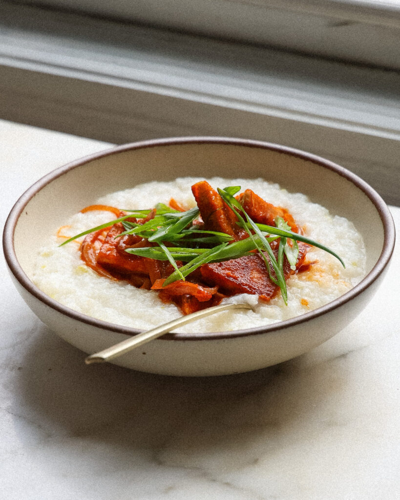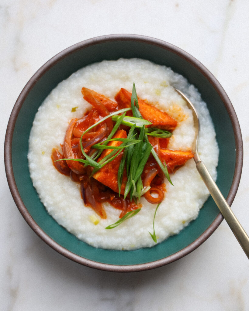 Of course, I like textural interest with all of my meals, so I find pairing congee with a crispy, spicy brown butter gochujang tofu and light, aromatic scallions makes the perfect meal. It’s equal parts fresh but comforting, vibrant but calm, and absolutely delicious. If you are looking for an easy, filling and vegetarian weeknight meal, I suggest you make this ASAP.