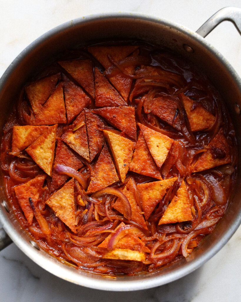 I toast the butter in the pan first, which darkens the milk solids and gives it a toasted, nutty flavor. From there the onions cook down in the butter and pick up on all of that richness. Next, the sauce goes in and as it simmers, the water reduces and the sauce emulsifies with the fat. This makes a thick, smooth sauce without much effort.