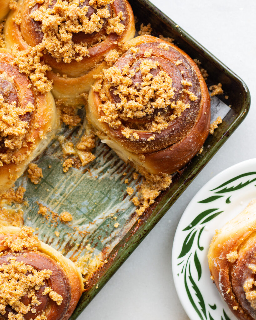 A note that I think cornmeal based recipes, and thus cornmeal, are not as prevalent in Australia – I used polenta which I retroactively realised was too coarse. I relied on the cornmeal softening a little in between the steamy roll layers in the oven (which it did) but that meant the crumble topping had a very sandy texture as it stood. I added some bakers flour, used some time in the fridge to pull it together as a crumble, and then baked it for 10 minutes on a tray separate to the rolls, to avoid a raw flour taste.