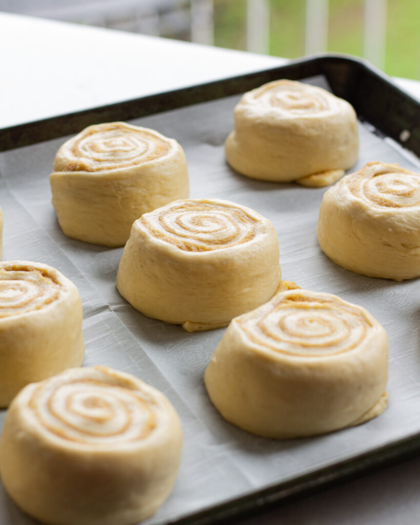 After rolling and cutting them, they will need an additional 2 hours to proof. You’ll want them nearly 50% bigger, with a nice, puffy look to them.