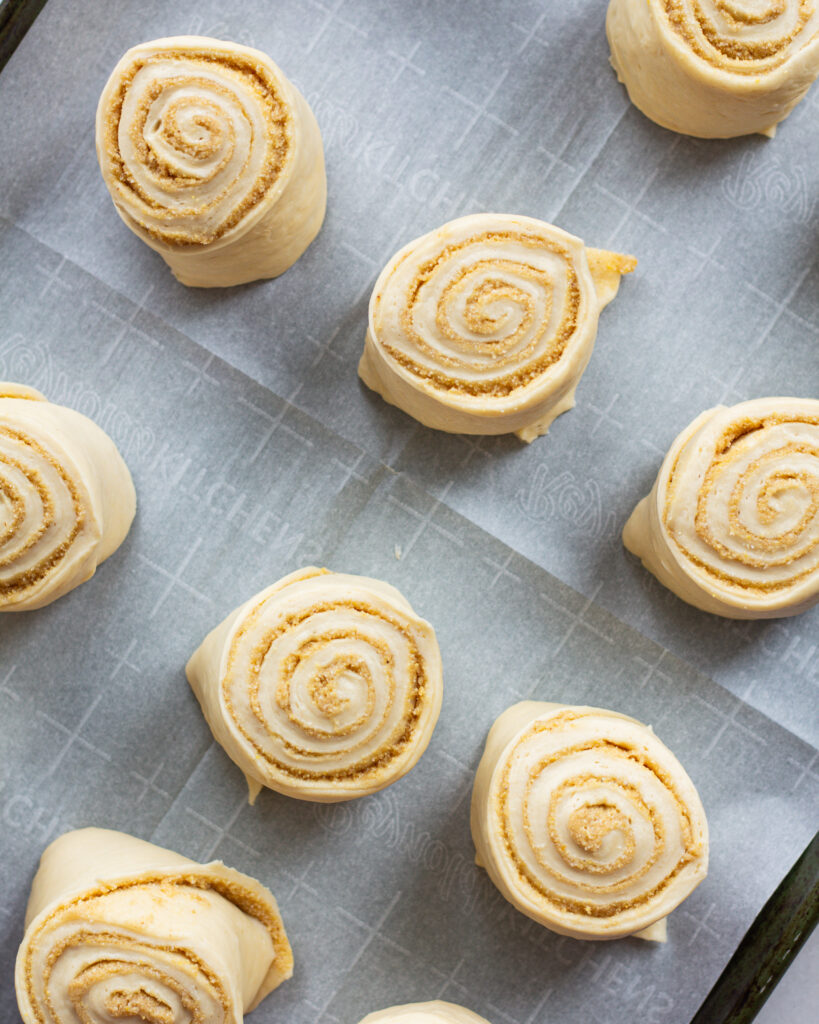 Tip #5 – Use a sharp knife or dental floss to cut the cinnamon rolls. With this recipe I’ve always used a sharp knife, since the dough can hold up to it. But some people (perfectionists, I’m looking at you!) use an unflavored dental floss to make the perfect cuts on their cinnamon rolls.
