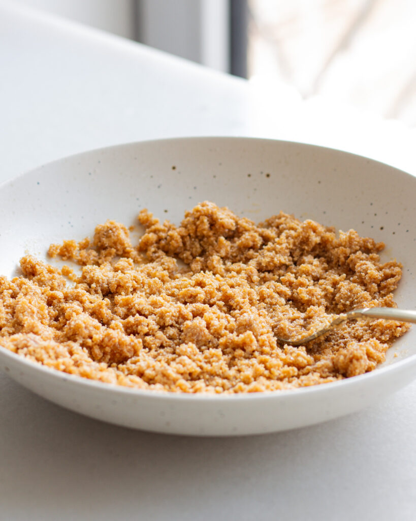 To make the crumble, follow the same beginning steps as you did with the cornmeal brown butter filling. Dry toast the cornmeal, then add the butter and let it foam, then later brown. Transfer this to a bowl and let it sit overnight at room temperature. It will fully solidify into something you can press out into a crumble.