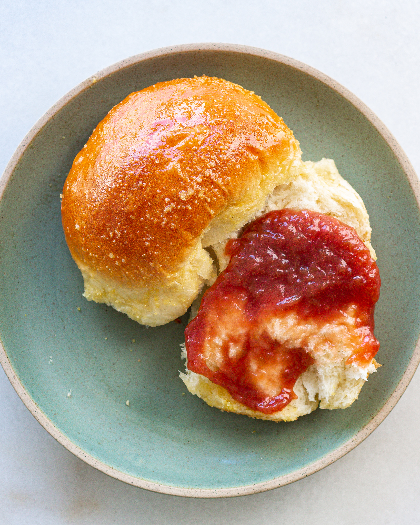 - When the rolls are out of the oven, brush liberally with the cornmeal butter and serve warm!