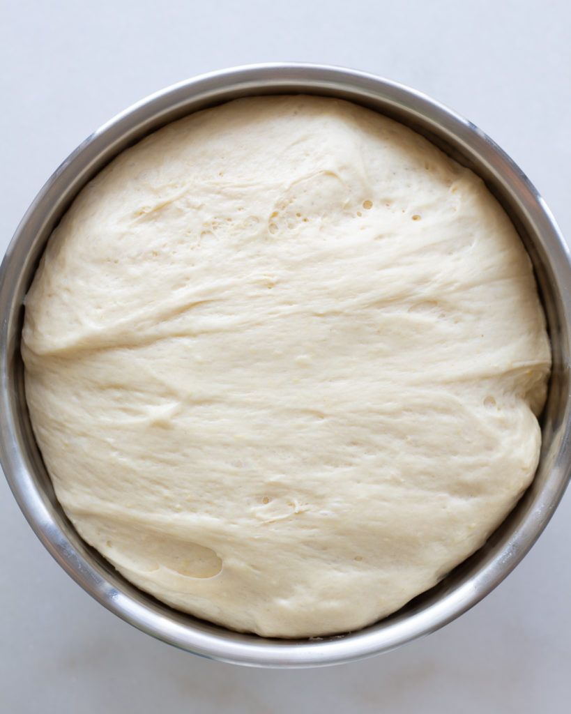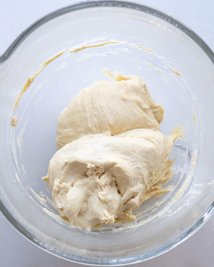 Beat the egg in a small bowl, and add the egg to the yeast mixture after the yeast has activated. Stir gently to combine. Add the yeast mixture in with the flour. Use the hook attachment on the stand mixer and mix on medium-low speed for 10 minutes. The dough will start loose and shaggy, but it will begin to form a smooth dough as gluten forms. Scrape down the sides as needed, and you’ll know the dough is ready when it completely pulls away from the sides of the bowl and twists around the hook.