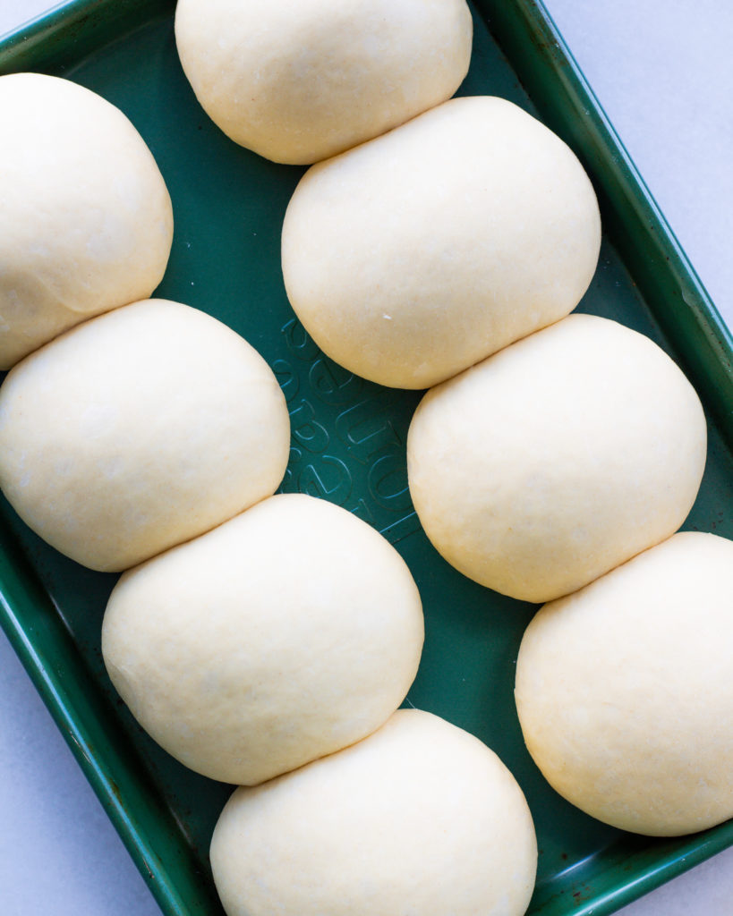 When the dough has doubled in size, punch it down and move it to a floured work surface. Cut the dough into 8 equal pieces and form the pieces into round balls. Transfer these to a parchment lined baking sheet, giving at least 2″ between dough balls. Let them rise another hour.