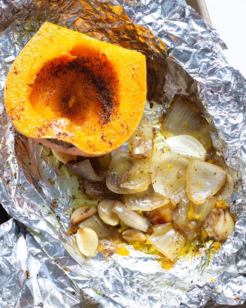 - Remove the seeds from the squash, peel the garlic cloves and slice the onion into large pieces. Place all the vegetables on a piece of foil large enough to wrap around them.