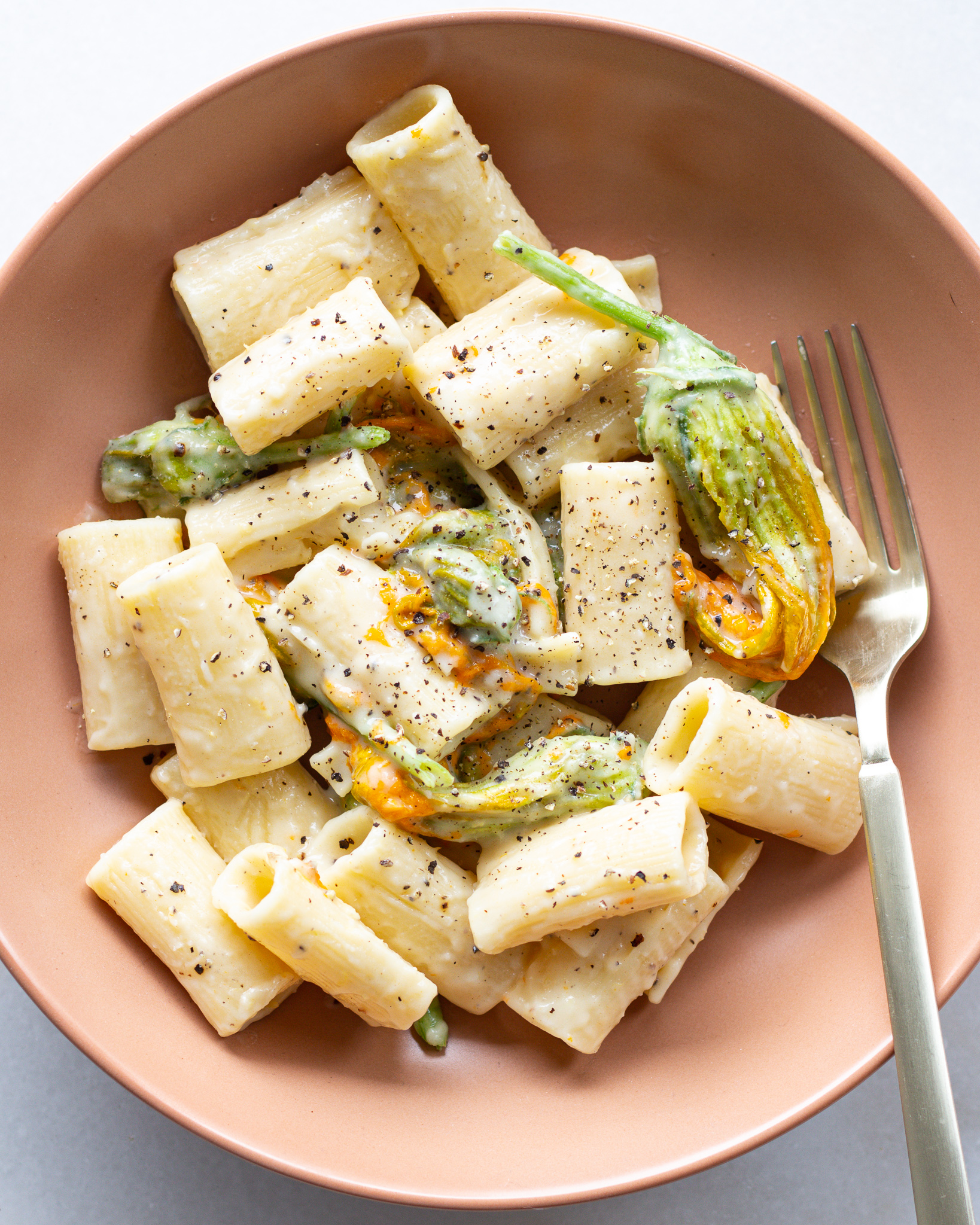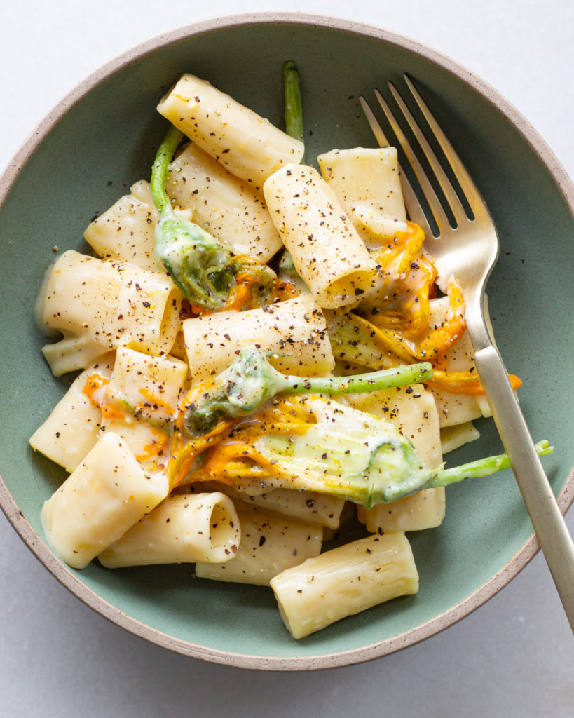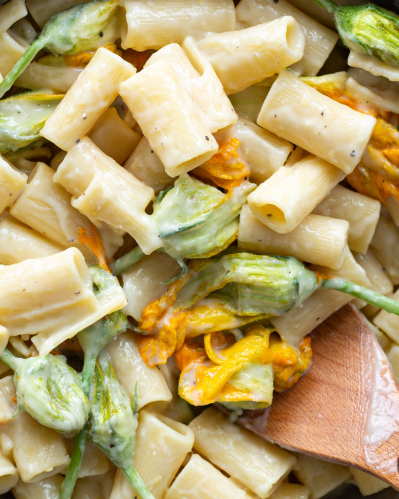 Toss in the squash blossoms and stir until they are as equally creamy as the pasta.