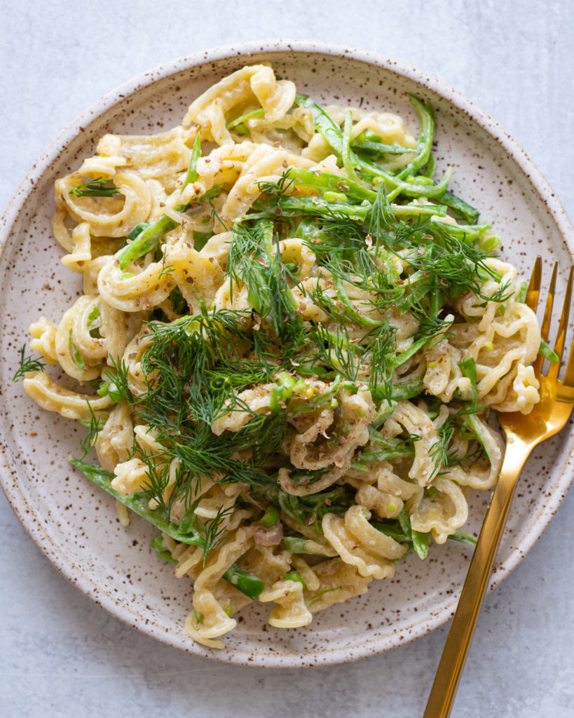 Sometimes we just need a creamy pasta, it’s good for the soul – and this creamy snap pea pasta proves it. It’s rich because of the tahini we add for the signature creaminess, but still bright and fresh and filled with spring flavors. It’s my current comfort food, and it screams “spring” to me. I just can’t get enough of this as the weather gets warmer and as we transition into summer.