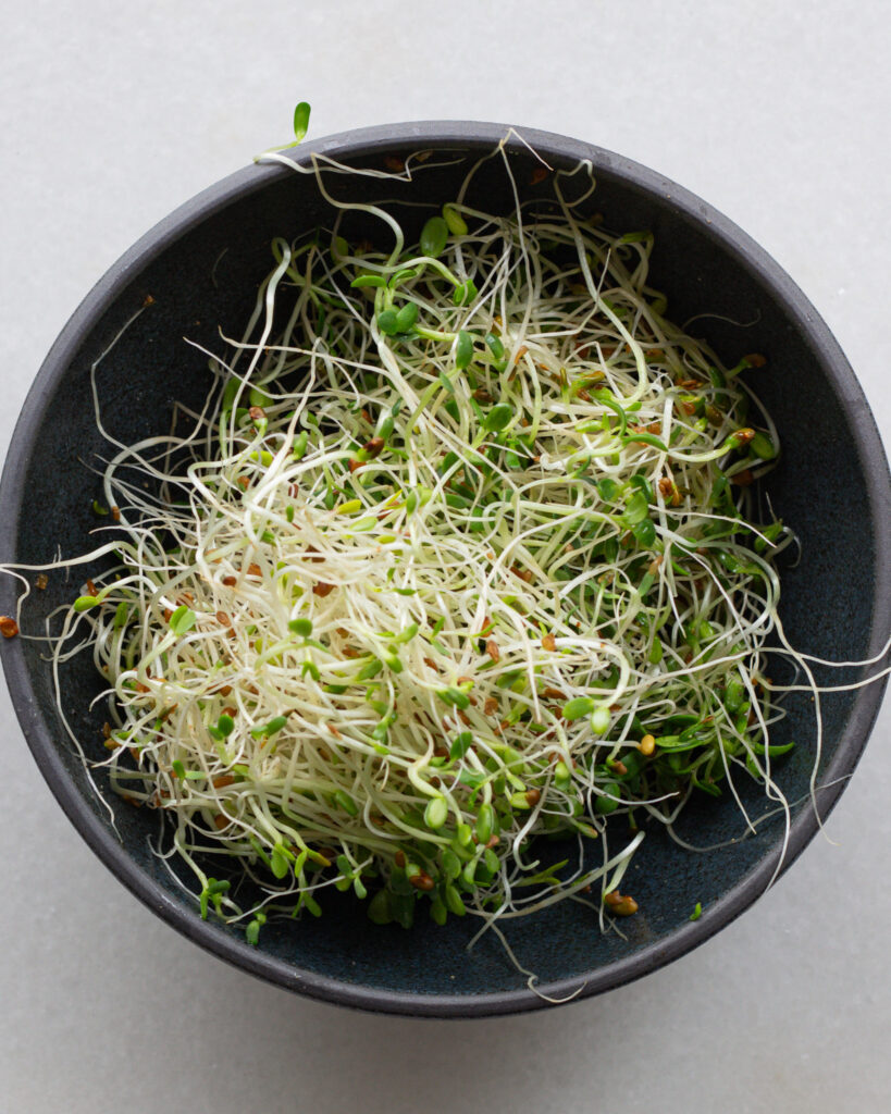 - To serve, scoop a healthy portion of the edamame spread onto each slice of toast. Top with the cucumber salad, then 1/4 cup of alfalfa sprouts per toast. Sprinkle with the seed mix and serve!