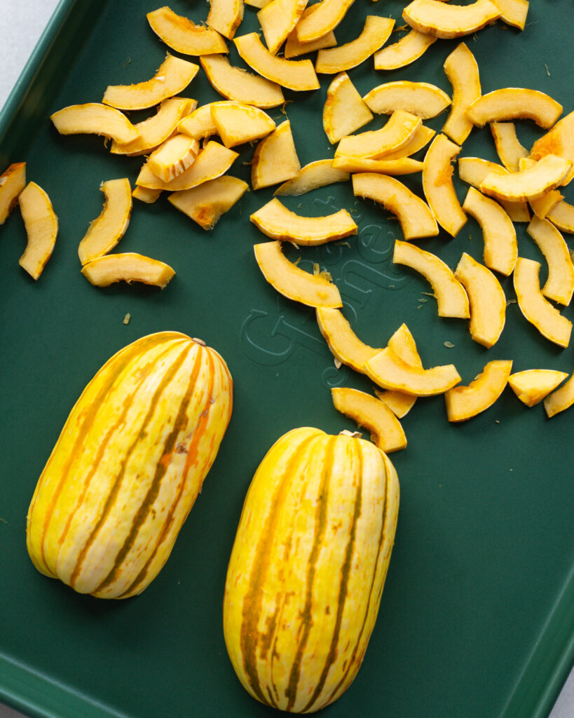 The squash is the easy part, you’ll want to roast it cut two ways. So preheat the oven to 400°F, cut one squash into pieces (see photo below) and the other squash in half. Roast at the same time for about 18-25 minutes!